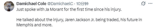 北京时间3月8日,灰熊队球员莫兰特自受伤后首次公开接受媒体采访,期间他谈到了小贾伦-杰克逊被交易、自己陷入交易流言以及自己的伤病恢复情况。