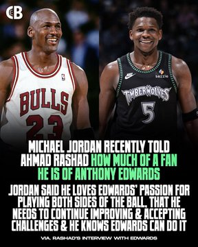拉沙德向爱德华兹转述道:“你知道吗?我昨天刚和他(指乔丹)聊过,我们还说到了你。他说他特别喜欢你在攻防两端的那股劲头,说你要继续提升自己的比赛,去迎接挑战、越打越好。他说你就是那种有决心、能做成事的人。能让乔丹成为你的球迷,什么感觉?”