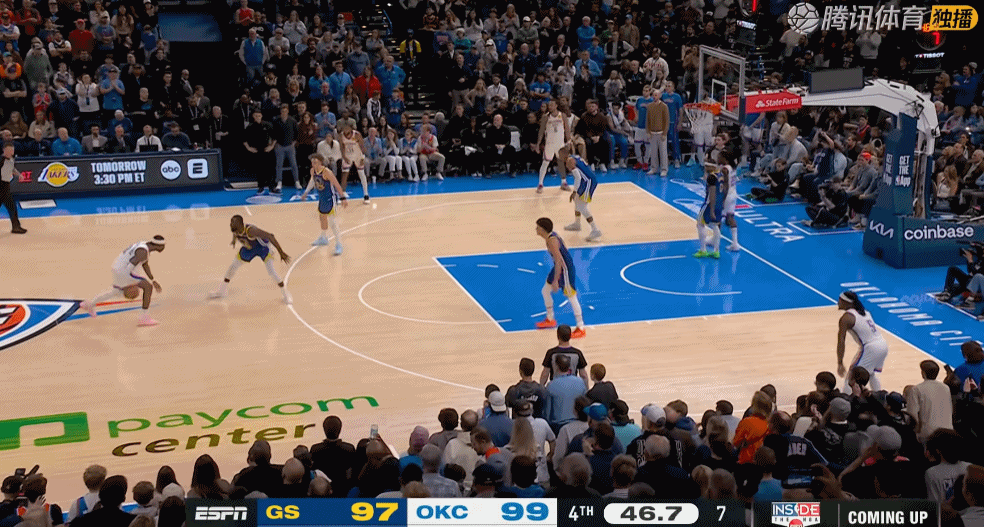 打勇士,亚历山大面对德雷蒙德-格林防守完成收割胜利的横撤步三分。