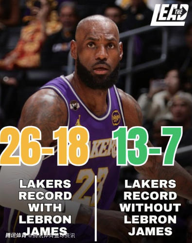 根据数据统计显示,本赛季当詹姆斯出战的时候,湖人队的战绩为26胜18负,胜率59.1%;缺阵的情况下13胜7负,胜率65.0%。而本赛季当东契奇和里夫斯同时出战,且詹姆斯没有出战的时候,湖人队的战绩为9胜2负。