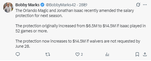 北京时间3月9日,根据NBA薪资专家鲍比-马克斯报道,魔术队已经与艾萨克修改了下赛季合同中的薪水保障条款。