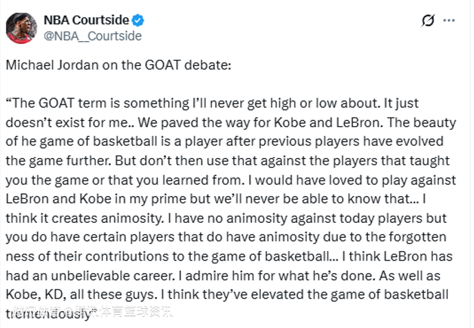 乔丹说道:“GOAT这个词,我从来不会因为它而情绪起伏。对我来说,这个词根本不存在。是我们为科比、詹姆斯铺平了道路。篮球最美的地方在于:后来的球员会在前人的基础上,把这项运动继续推向更高的水平。”