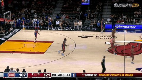 第一节还剩11分28秒时,杜伦突破上篮命中为活塞先拿2分,第一节还剩11分02秒时,D-米切尔上篮命中帮助热火追成2-2。随后从第一节还剩11分28秒到还剩1秒,热火打出34-16的进攻高潮,阿德巴约在第一节还剩6分46秒时空切上篮命中,并在节末罚球再添2分,坎宁安在第一节还剩4分14秒命中三分,活塞首节结束以16-34落后18分。