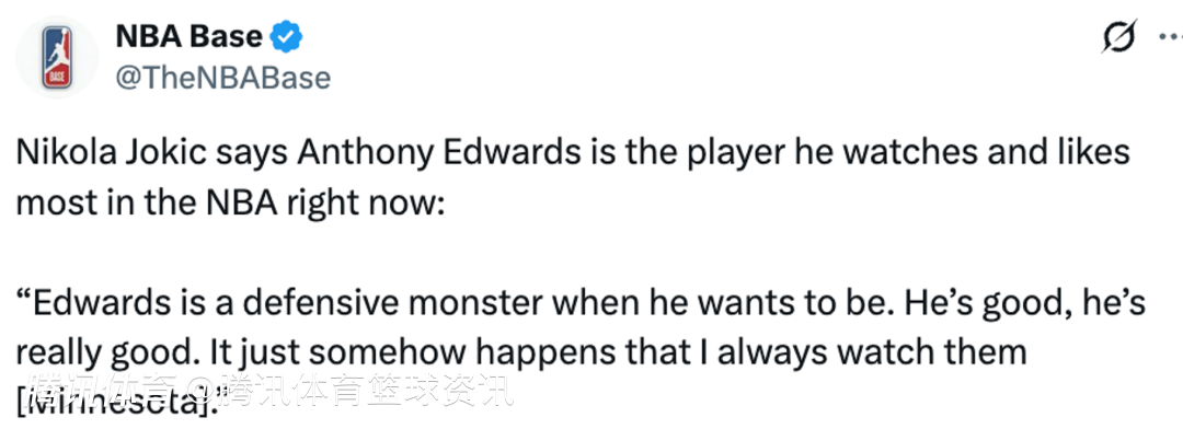 约基奇表示,华子是他目前在NBA最常关注,也是最喜欢的球员:“只要爱德华兹想认真防守,他就是个防守怪兽。他太出色了,真的非常强。不知怎么回事,我总是会关注森林狼的比赛。”
