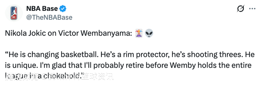 谈及目前马刺的当家球星文班亚马,约基奇表示:“他正在改变篮球这项运动。他既能护筐,又能投三分,独一无二。我很庆幸,自己可能会能在文班彻底统治联盟之前退役。”