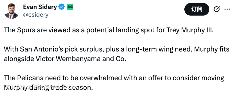 Evan Sidery表示,凭借圣安东尼奥队充足的选秀权储备,加上球队长期存在的侧翼位置需求,墨菲与文班亚马等人的阵容适配度很高。而鹈鹕队需要收到极具诱惑力的报价,才会考虑在交易窗口期送走墨菲。