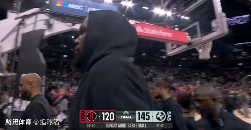 末节火箭一直落后,杜兰特登场后不仅未能带队缩小分差,而且再次落后到20分,比赛还剩4分13秒火箭撤下主力提前认输,最终火箭在客场120-145惨败25分,赛后杜兰特沮丧离场。