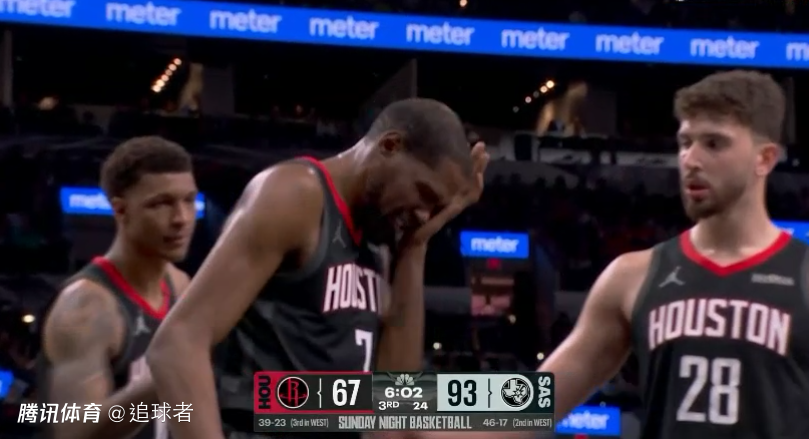 易边再战,第三节火箭溃败并且被马刺打出24-8的超级攻势,火箭26分后杜兰特继续带队抵抗,持球杀到禁区试图隔扣对手,被科内特肘击到面部,痛苦捂脸太难受,在KD的带领下,火箭把分差追到20分以内,不过三节打完火箭仍94-110落后16分,这一节杜兰特3投2中拿到10分,禁区发狠大帽哈珀。