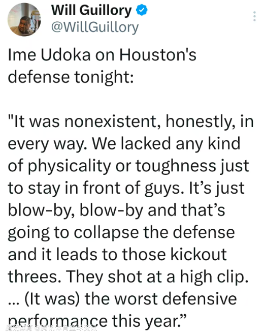 乌度卡表示:“坦白讲,我们今晚的防守完全失效,各个环节都没做好。球队没有对抗强度,也没有强硬的比赛态度,根本挡不住对手的突破。被对方连续过掉后,防线直接崩盘,频频被对手分球命中三分,对手命中率也居高不下。这绝对是我们本赛季至今,防守端打得最差的一场比赛。”