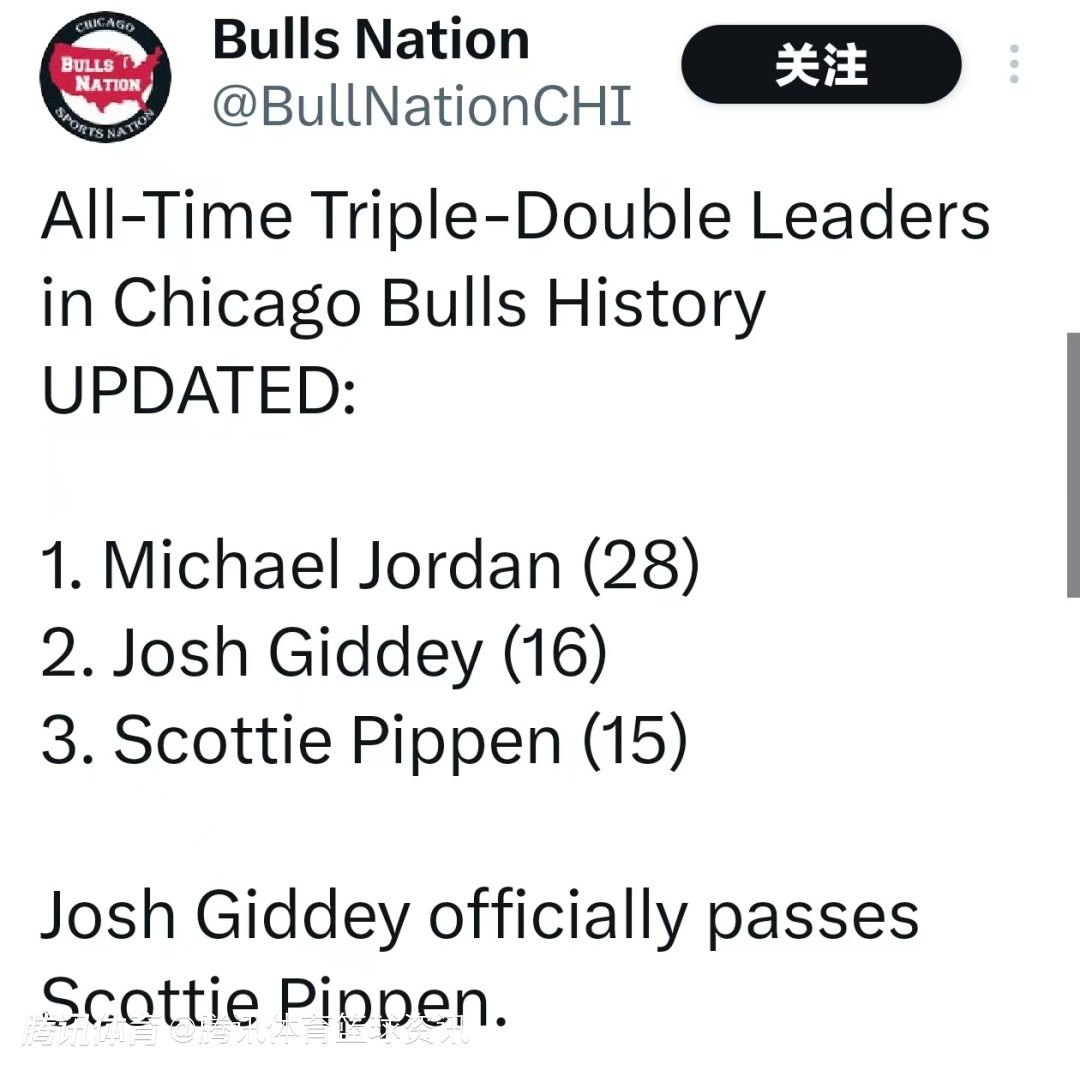 凭借这次三双,吉迪以16次三双超越名宿斯科蒂-皮蓬(15次),升至公牛队史三双榜第二位,仅次于排名榜首的传奇球星迈克尔-乔丹(28次)。