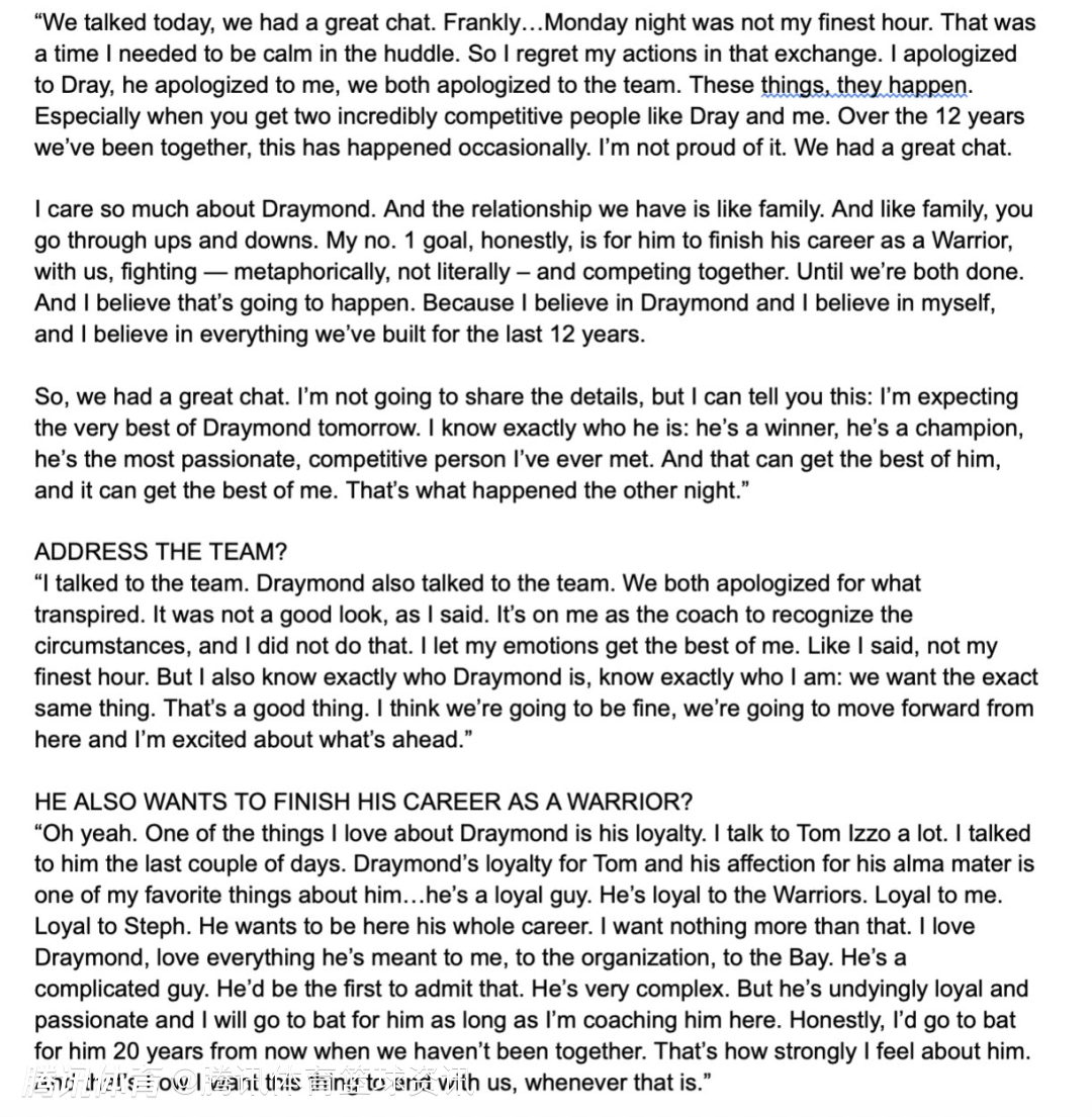 “所以,这次谈话的效果很好。具体内容我不便透露,但我可以告诉大家:我对追梦明天的表现充满期待。我太了解他了,他是天生的赢家,是冠军级别的球员,更是我这辈子见过的最富激情、求胜欲最旺盛的人。但也正是这份冲劲,有时会冲昏他的头脑,同样也会让我失去理智。那天晚上发生的事,就是这么一回事。”