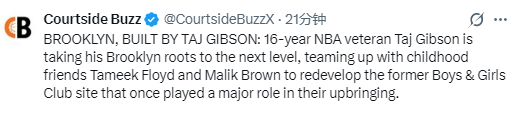 北京时间12月25日,16 年NBA老将塔吉-吉布森正将自己与布鲁克林的深厚渊源推向新高度,他携手儿时好友塔米克-弗洛伊德、马利克-布朗,共同推动一处旧址的重建计划,这里曾是少年男女俱乐部的所在地,更是见证三人成长轨迹的重要场所。