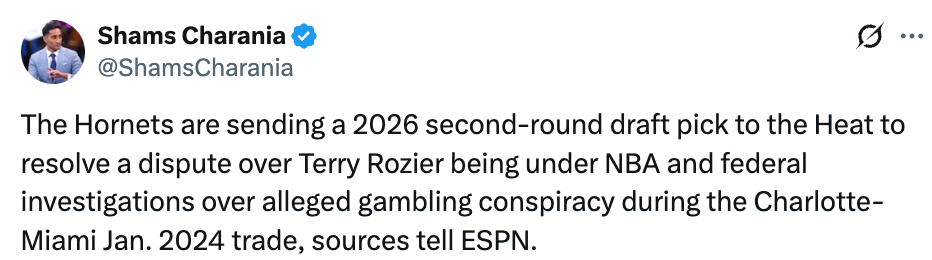 北京时间3月10日,据名记Shams报道,热火将从黄蜂获得一个次轮选秀权(为今年的选秀权),以解决双方在2024年1月罗齐尔交易中的纠纷 —— 该纠纷围绕罗齐尔在交易时正处于NBA及联邦机构对其涉嫌赌球共谋的调查这一情况展开。