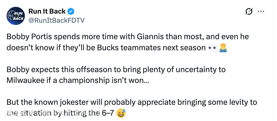 “所以,我真不知道下赛季会是什么局面。也不知道总经理乔恩和他的团队会怎么运作,怎么补强阵容,让我们更有竞争力去冲冠。这些我都不清楚。但你要问我留队信心,我只能说大概就在中间档位。从我2020年到这儿开始,每年夏天都是这样:只要球队赛季结束、被淘汰了,离队流言就会再次被提起,整个夏天都会没完没了,尤其是在选秀前后。所以只能等等看了。但我觉得,可能性大概就是5到7分之间,6、7分那样吧。”