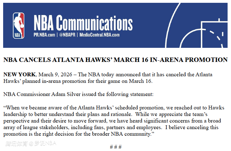 NBA总裁萧华发表如下声明:“当我们得知亚特兰大老鹰队的场内推广计划后,立即与球队管理层取得联系,以更好地了解他们的计划和理由。尽管我们理解球队的立场以及他们向前推进的意愿,但我们也听到了来自联盟广泛利益相关方(包括球迷、合作伙伴和员工)的重大关切。我相信,取消这项推广活动,对于更广泛的NBA社区而言是正确的决定。”