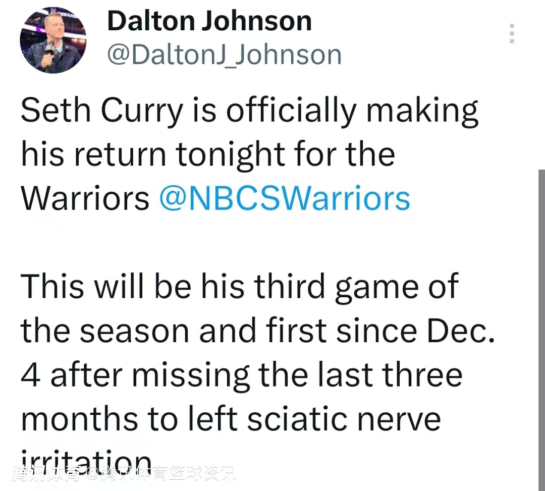 北京时间3月10日,NBA常规赛继续进行,勇士对阵爵士。赛前,勇士方面更细球队本场比赛伤情报告,塞斯-库里将正式回归,代表勇士出战。这将是他本赛季的第三场比赛,也是他自12月5日以来的首秀。此前他因左侧坐骨神经刺激缺席了近三个月。