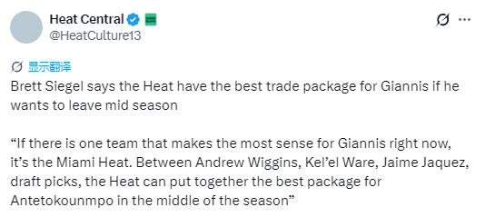 北京时间12月25日,根据记者Brett Siegel的报道,若字母哥赛季中期寻求离队,热火将手握最优交易筹码。