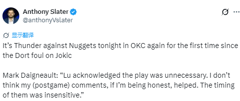 这也是多尔特对约基奇犯规事件后,两队首次在俄克拉荷马重逢。当被问及今晚是否会存在敌对情绪时,戴格诺特表示:“卢(多尔特)已经承认那次动作是不必要的。说实话,我赛后的那些评论并没有起到帮助作用,时机也显得不够妥当。当时我处于保护球队的立场,但这个表态确实不合时宜。”