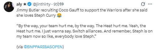 北京时间3月10日,本赛季已提前报销的勇士球星巴特勒近日拄双拐亮相网球场,期间与美国网球名将高芙展开了一段有趣的对话。巴特勒在高芙表示自己喜欢库里之后,当场“招募”她支持勇士队
