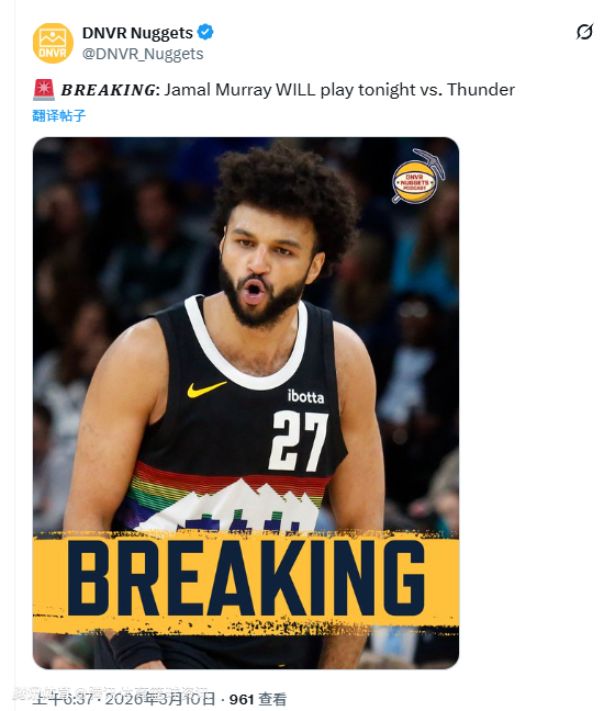 北京时间3月10日,NBA常规赛继续进行,掘金对阵雷霆。赛前,掘金官方更新球队伤情公告,核心后卫贾马尔-穆雷本场火速复出。