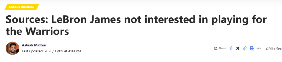 北京时间3月10日,据Lakers Daily消息源透露:如果勒布朗-詹姆斯今年休赛期不退役,他下赛季无意为金州勇士效力。