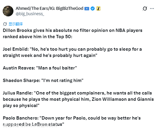 北京时间3月10日,狄龙-布鲁克斯在一档节目中,被问及自己未能入选NBA Top50排名的看法时,毫不避讳地分享了个人观点,还逐一点评了多位排名在他之前的球员,以下是其点评内容的部分节选。
