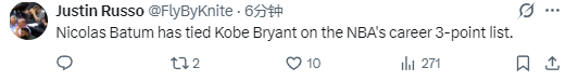 北京时间3月10日,NBA常规赛继续进行,快船队对阵尼克斯队。本场比赛,快船队球员巴图姆迎来里程碑,他的常规赛生涯总三分命中数达到1827个,追平了湖人名宿科比-布莱恩特,升至NBA历史第30位。