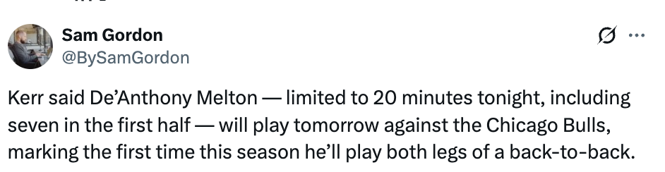 另外,科尔也表示梅尔顿今晚出场时间被限制在20分钟,其中上半场仅打了7分钟,明天他将出战对公牛的比赛,这将是他本赛季首次在背靠背赛程中连打两场。