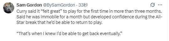 在谈到复出的感受时,塞斯-库里说道:“球队给我提供了很好的恢复保障。过去这几个月我真的很努力,努力去康复、去回归。我很高兴自己终于能重新上场,为球队做出贡献。”