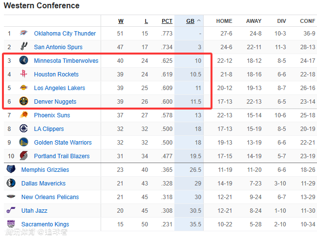 西部最新排名——1、雷霆51胜15负(6连胜);2、马刺47胜17负(4连胜);3、森林狼40胜24负;4、火箭39胜24负;5、湖人39胜25负;6、掘金39胜26负