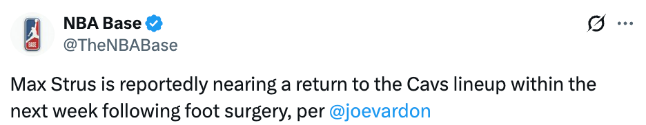 北京时间3月10日,据美记Joe Vardon报道,此前接受了脚部手术的斯特鲁斯,预计将在未来一周内回归骑士阵容。