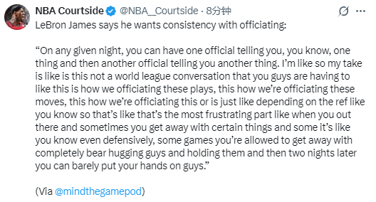 北京时间3月10日,湖人球星詹姆斯在最新一期《球场大脑》节目中谈及裁判尺度话题,希望吹罚尺度保持一致。