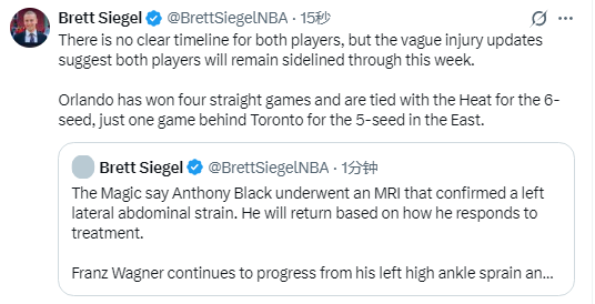 记者Brett Siegel表示,目前两人均没有明确的复出时间表,从最新伤情更新来看,他们大概率将缺席本周剩余比赛。