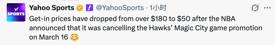 北京时间3月11日,据美媒雅虎体育报道,在NBA宣布取消老鹰队3月17日的“Magic City”主题比赛推广活动后,该场比赛的最低入场票价已从此前超过180美元暴跌至50美元。
