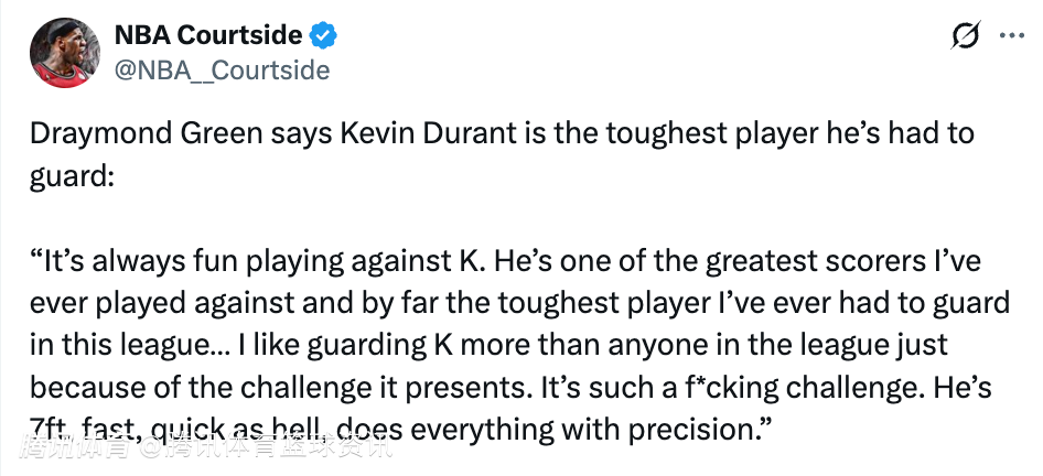 追梦表示:“和杜兰特对位总是很有意思。他是我交手过的最伟大得分手之一,也是迄今为止联盟里我最难防的球员,在这个联盟里,我最喜欢防守KD,就因为这本身就是一种挑战 —— 真的是太他难了。他身高2米11,速度极快,动作敏捷,每一项技术都精准得可怕。”