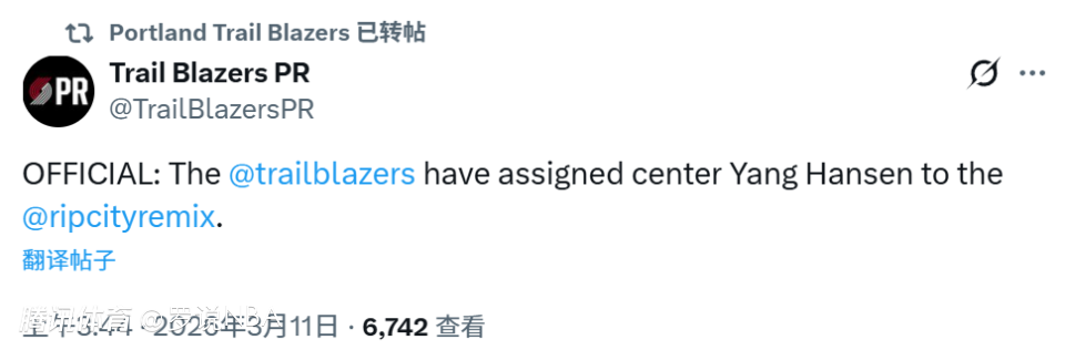 北京时间3月11日,开拓者官方宣布,将中锋杨瀚森下放至发展联盟混音队。赛季至今,杨瀚森代表开拓者出战38场比赛,场均上场时间只有7.3分钟,得到2.2分1.5篮板0.6助攻。