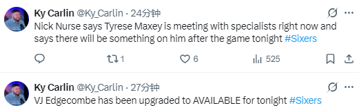 纳斯表示,马克西目前正在接受专家会诊,今天赛后会公布相关情况。埃奇库姆状态升级,可以出战今天的比赛。