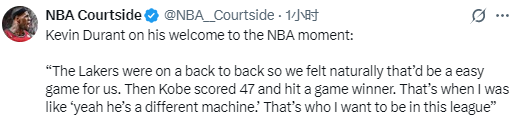 杜兰特说道:“当时湖人正处在背靠背赛程,我们本来觉得这场比赛肯定会很轻松。结果科比狂砍47分,还投进了绝杀球。那一刻我就在想:他真的是另一个级别的球员,这就是我想在这个联盟成为的样子。”