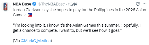 北京时间3月11日,效力于尼克斯队的球员克拉克森接受媒体采访,表示自己想代表菲律宾男篮出战2026年名古屋亚运会。