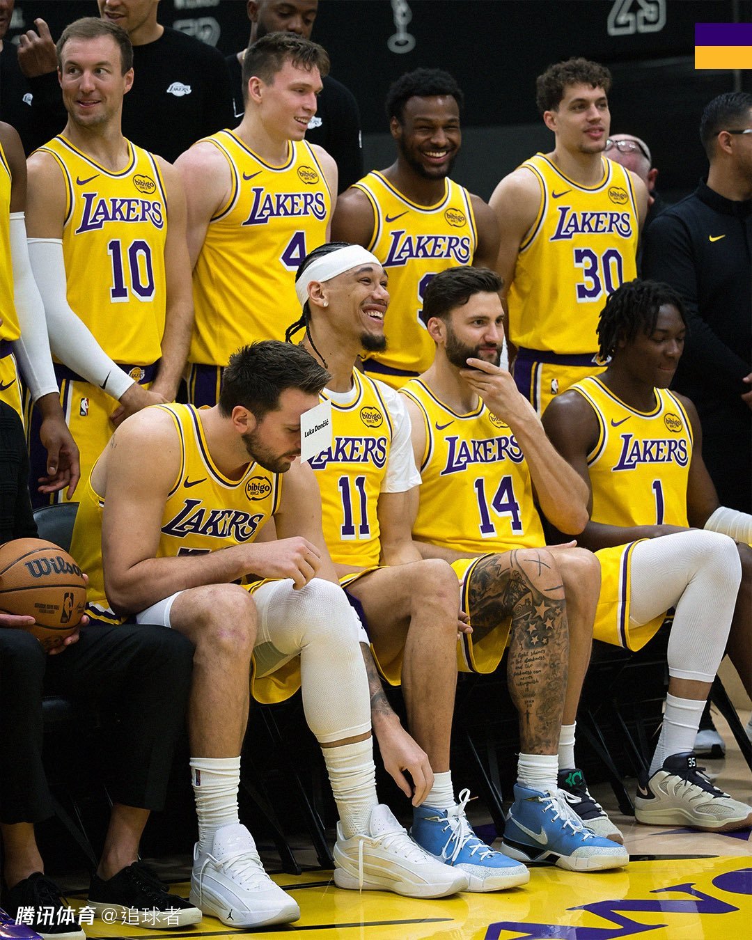 湖人全队已经拍摄全家福;在湖人大合影上,湖人篮球运营总裁和总经理佩林卡抱球坐在C位,东契奇和詹姆斯坐在佩总两侧,坐在第一排的球员还有艾顿、范德比尔特、蒂米、海斯、克勒贝尔和阿杜-蒂耶罗。