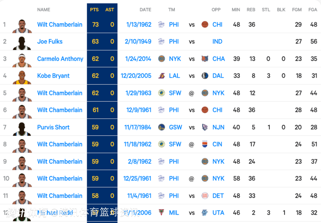 上一位单场至少拿到57分0助攻的球员,还是2006年11月12日的雄鹿球员迈克尔-里德,当时他在对阵爵士的比赛中,单场32中18,拿到57分,且没有一次助攻。