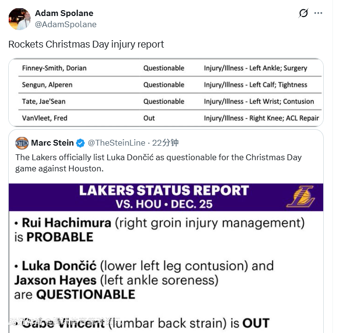 北京时间12月25日,NBA圣诞大战明日打响,湖人将对阵火箭。赛前,两支球队分别公布本场比赛伤情报告,东契奇有望复出,申京出战成疑,芬尼-史密斯或迎首秀。