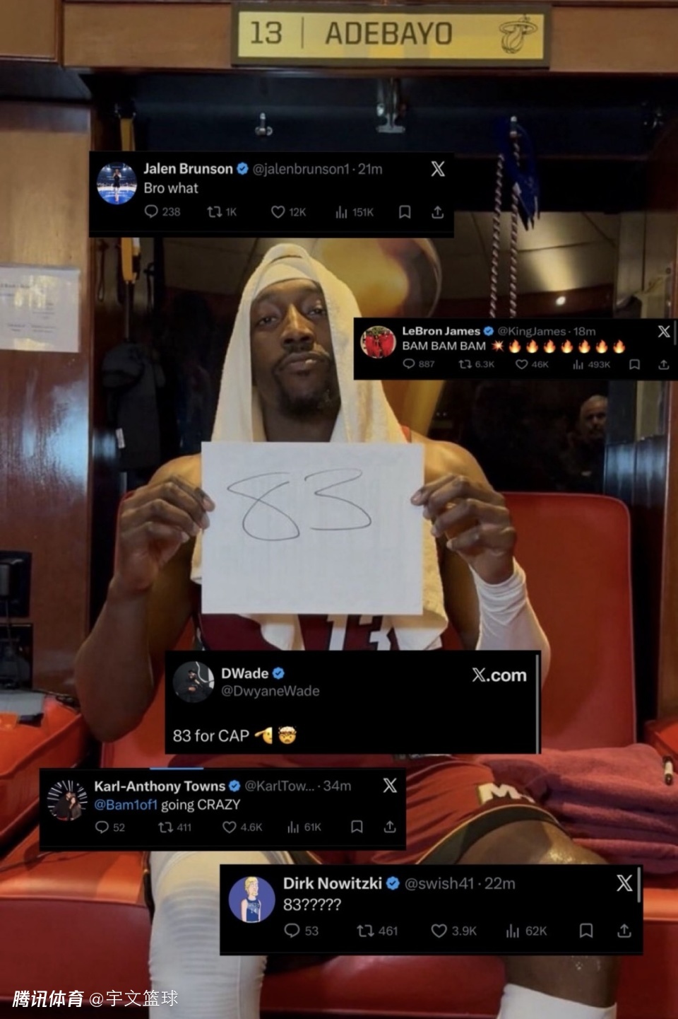 赛后,阿德巴约手持经典的83分纪录纸进行合照留念,他成功冲上全美热搜榜首引起热议,多名球星为他送上祝福。