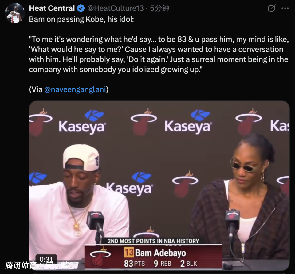 除此以外,阿德巴约谈到了超越科比。“对我来说,我一直在想他会说什么。如果我83分了,成功超过他,我就会想‘他会对我说什么?’,因为我一直都想和他聊聊天,他可能会说‘再来一次’。能和自己从小崇拜的人在一起,真是太不可思议了。”