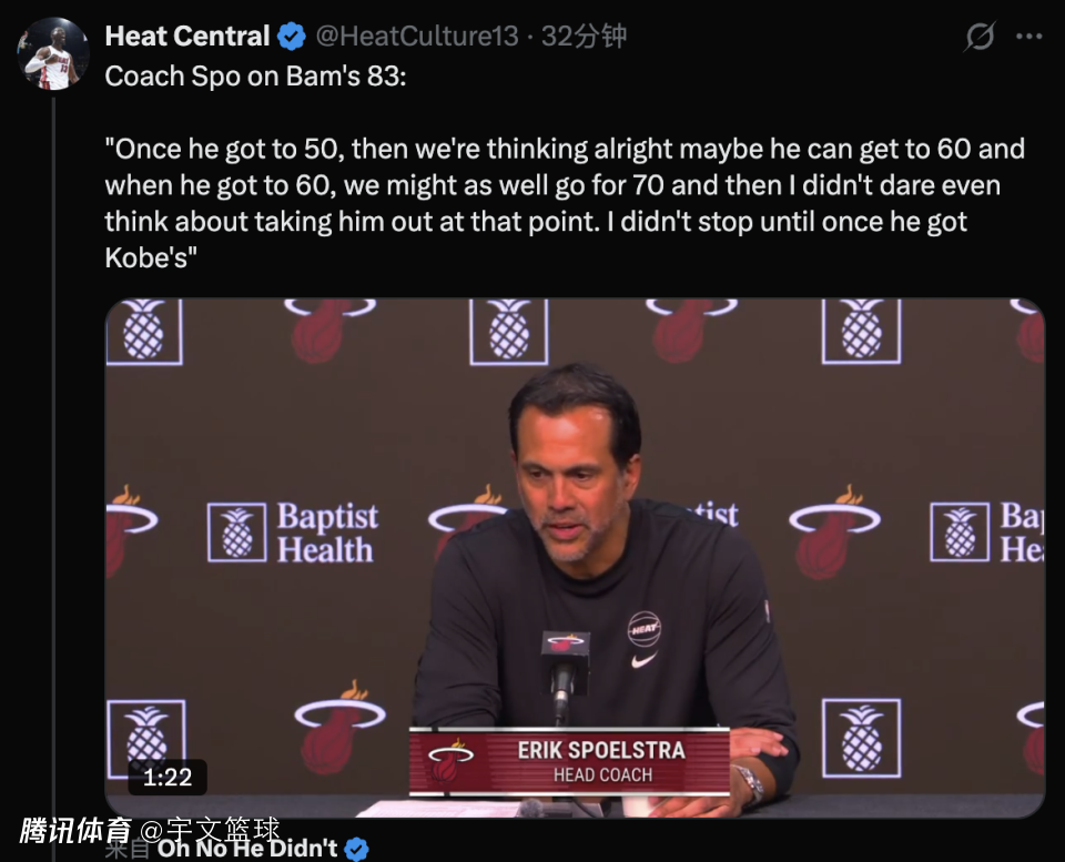阿德巴约在首节比赛就成功统治进攻端狂砍31分,一人得分比对手全队还要多,他仅用半场时间就已经拿到43分刷新生涯新高。下半场比赛,热火明显有意为阿德巴约创造得分机会,让他尽情刷分。即便末节比赛胜负已无太多悬念,斯波尔斯特拉仍然让阿德巴约几乎打满整节,并且通过一次罚球超越科比,随后被换下接受全场欢呼。