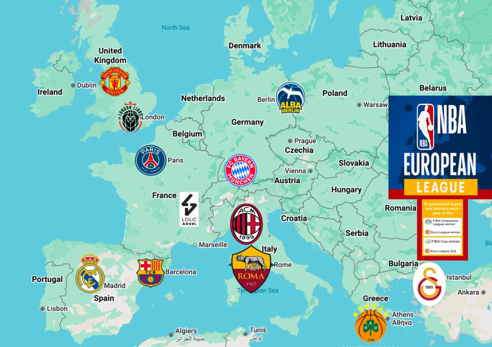 NBA欧洲联赛计划由16支俱乐部组成,12支与NBA一样是特许经营“常驻俱乐部”,另外4支留给国际篮联现有欧洲赛事的参赛队,每赛季根据成绩确定。联赛将由欧洲现有篮球豪门、新成立篮球俱乐部和目前没有篮球队的足球俱乐部组成,足球和篮球双料豪门的皇马、巴萨、拜仁、费内巴切是最大热门。
