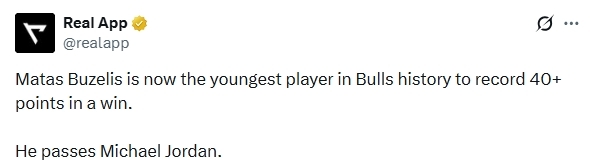 布泽利斯砍下41分,不仅创下职业生涯新高,同时他也成为了公牛队历史上第3位能在21岁前单场砍下40+的球员(另外2人是迈克尔-乔丹和布兰德)。同时,他还超越了乔丹,成为了公牛队历史上能单场砍下40+且率队取胜最年轻的球员。