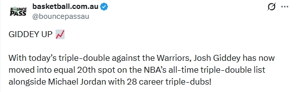 吉迪是公牛队历史上首位能单场得到至少21分13篮板17助攻的球员,单场17次助攻也追平了他职业生涯单场助攻的最高纪录。此外,这是吉迪职业生涯第28次砍下三双,他追平了乔丹,并列排在NBA历史三双榜第20位。