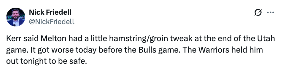 科尔表示,梅尔顿在上场对阵爵士的比赛末段,腹股沟出现了轻微拉伤,在今天对公牛的赛前,他的伤势有所加重,勇士队为了安全起见,让他缺席了今晚的比赛。