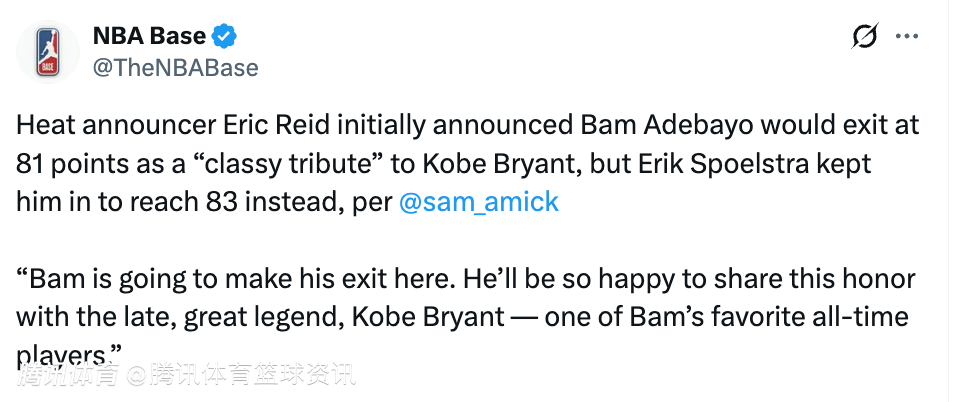 Sam Amick表示,热火播音员埃里克-雷德最初宣布,阿德巴约将在得到81分时下场,以此向科比致以体面的致敬,但斯波尔斯特拉最终选择让他继续留在场上,让他拿到了83分。